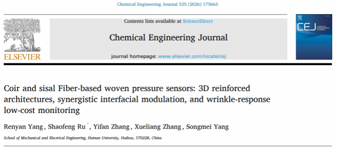 针对传统柔性传感器高度依赖不可降解的石化基高分子材料与昂贵金属,导致制造成本高、透气性差及易引发电子废弃物污染等痛点问题,汝绍锋副教授团队立足海南丰富的热带农业废弃物(椰壳纤维与剑麻纤维),提出了一种低成本的智能传感纺织品制造新策略。研究创新性地揭示了织物交织点天然形成的“褶皱展开-重构”主导的非线性传感新机制,为利用天然纤维构建高性能传感器提供了全新理论支撑。
