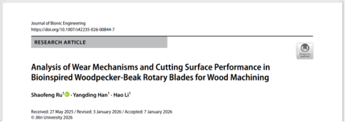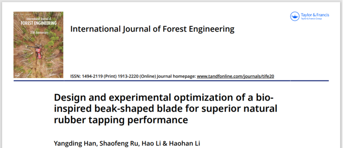 近日,太阳成集团tyc234cc汝绍锋副教授团队在新型木材加工刀具及天然橡胶割胶技术领域取得系列研究进展。团队基于啄木鸟喙部生物仿生学原理,系统性地开展了旋转式木材切削刀具的设计、机理分析与性能优化研究,并对传统V形割胶刀的切削机理进行了深入探索。相关成果连续发表在国际期刊《Journal of Wood Science》《Journal of Bionic Engineering》及《International Journal of Forest Engineering》上。